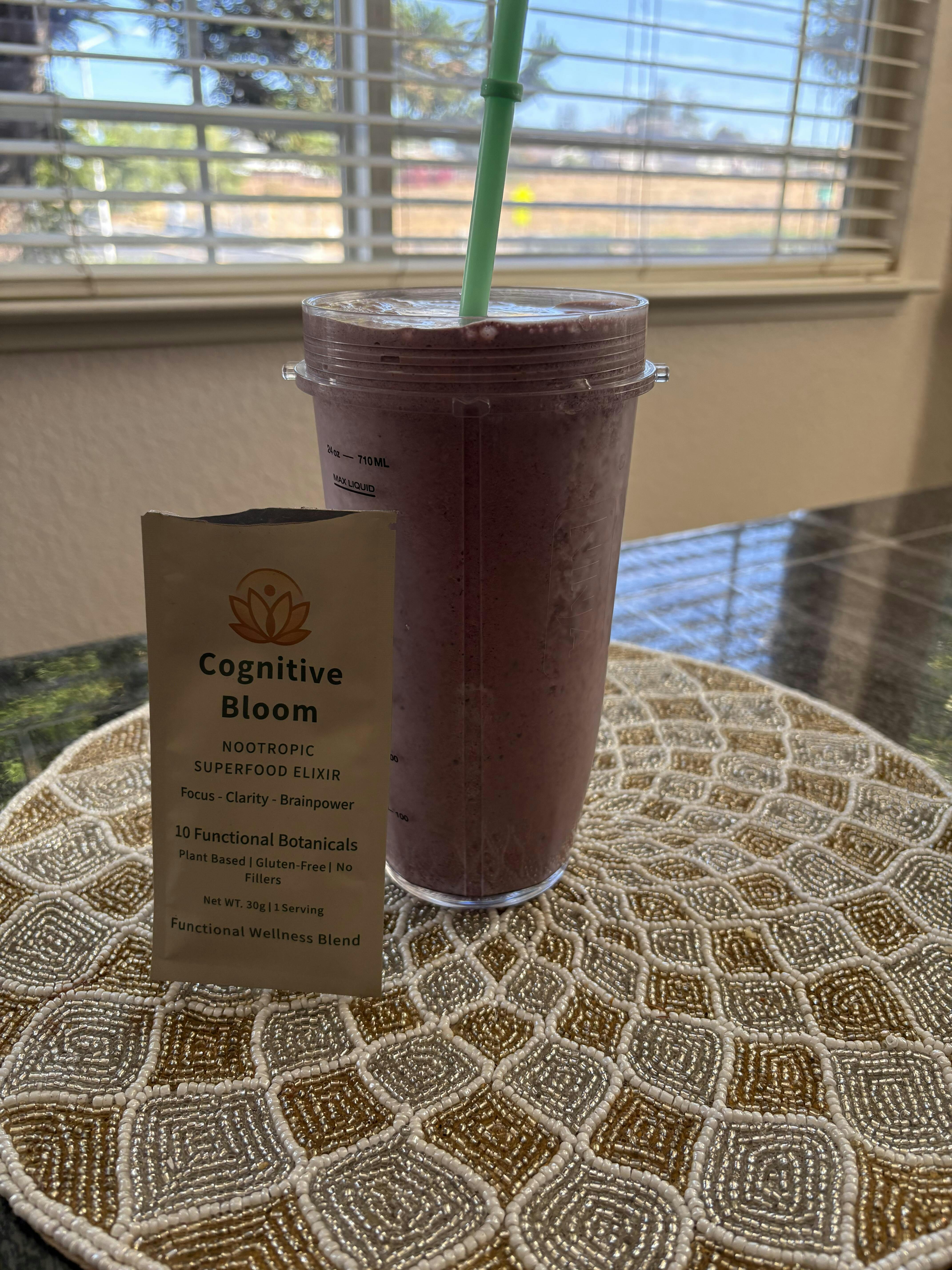 Awaken your mind with Cognitive Bloom™ — a premium nootropic elixir crafted to enhance focus, memory, and overall brain performance. Each scoop is a synergistic blend of 10 powerful botanicals, adaptogens, and superfoods designed to support your cognitive rhythm without caffeine or crashes. Lightly earthy with a hint of cacao, it blends effortlessly into your daily ritual.